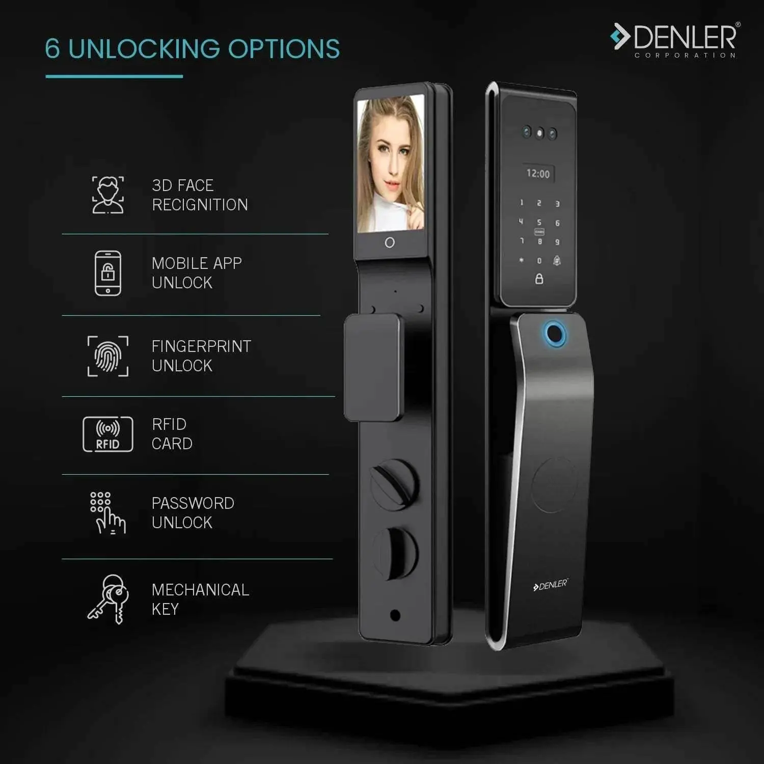 Denler FLv8 8-in-1 Smart Door Lock | Doorbell Lock | Alexa Voice Unlock | 3D Face ID | RF Remote | Fingerprint | IP65 Waterproof | Anytime Video